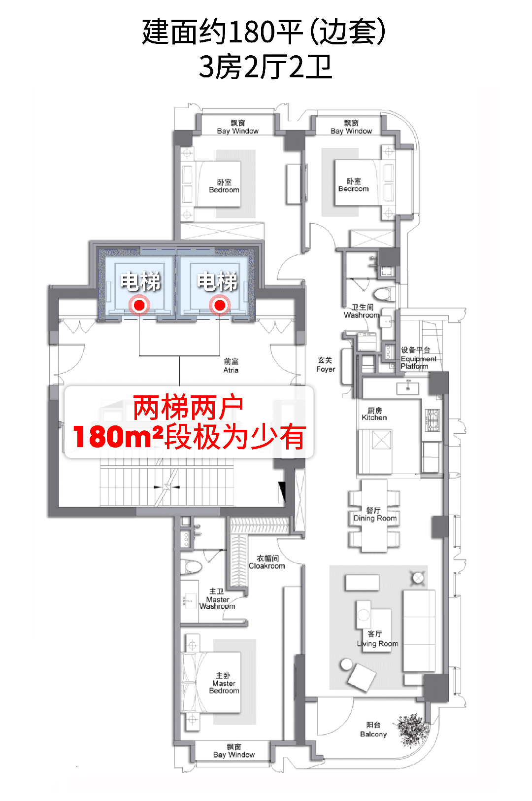 在空间配置上,两梯两户的专属设计同级少有;边套户型更坐拥三面采光优势,北向次卧双面采光设计,这在同面积段产品中极为罕见。