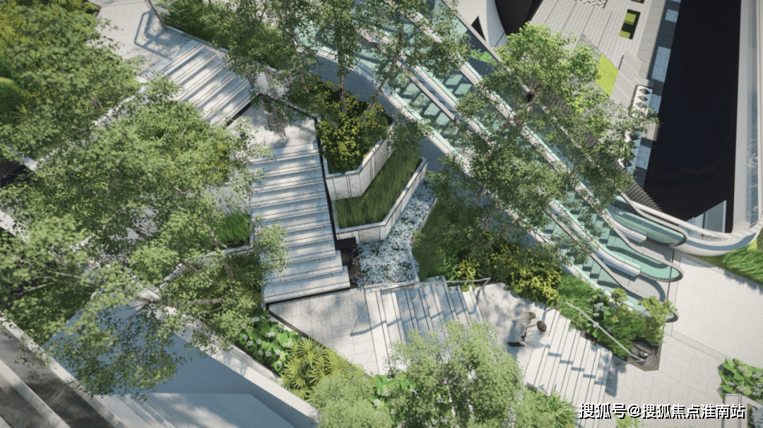 楼王东侧就是三大花园的其中之一,也是艺术感最强的一个花园,将结合艺术装置和台阶,为业主提供舒适闲坐、眺望树冠景观的空中露台。